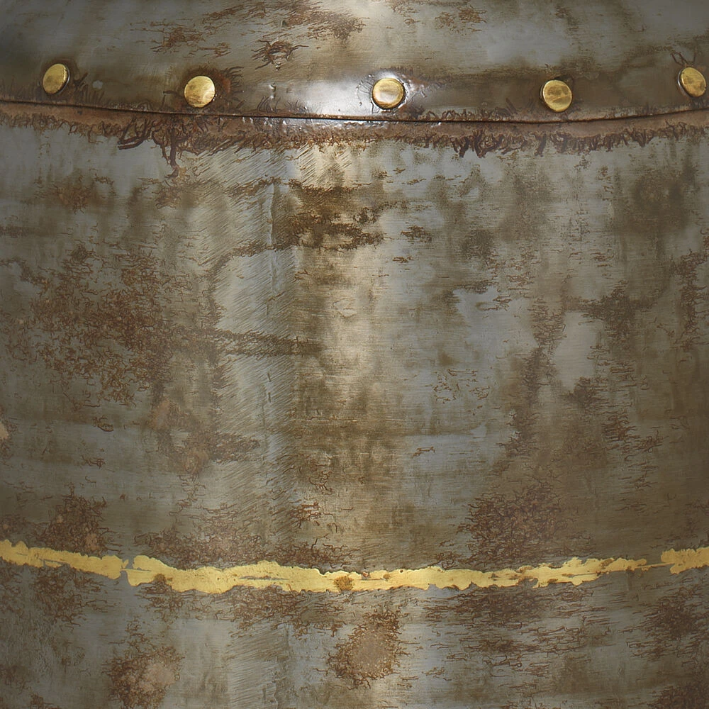 This large scale piece has a raw rugged surface and texture in a natural iron finish with brass welds and rivets.