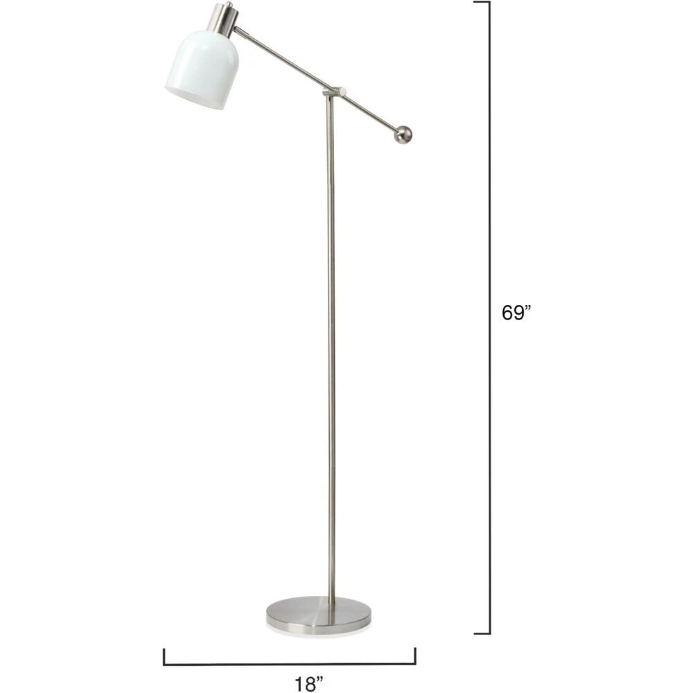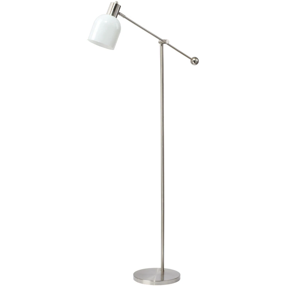 The brushed nickel metal of this lamp’s body contrasts beautifully with its white glass shade, and takes on an even more beautiful warm ombre effect when lit. The modern ball-capped handle makes it simple to adjust the lamp’s height to your desired angle. Sleek and sophisticated, this shorter floor lamp adds fresh style to your room’s decor.