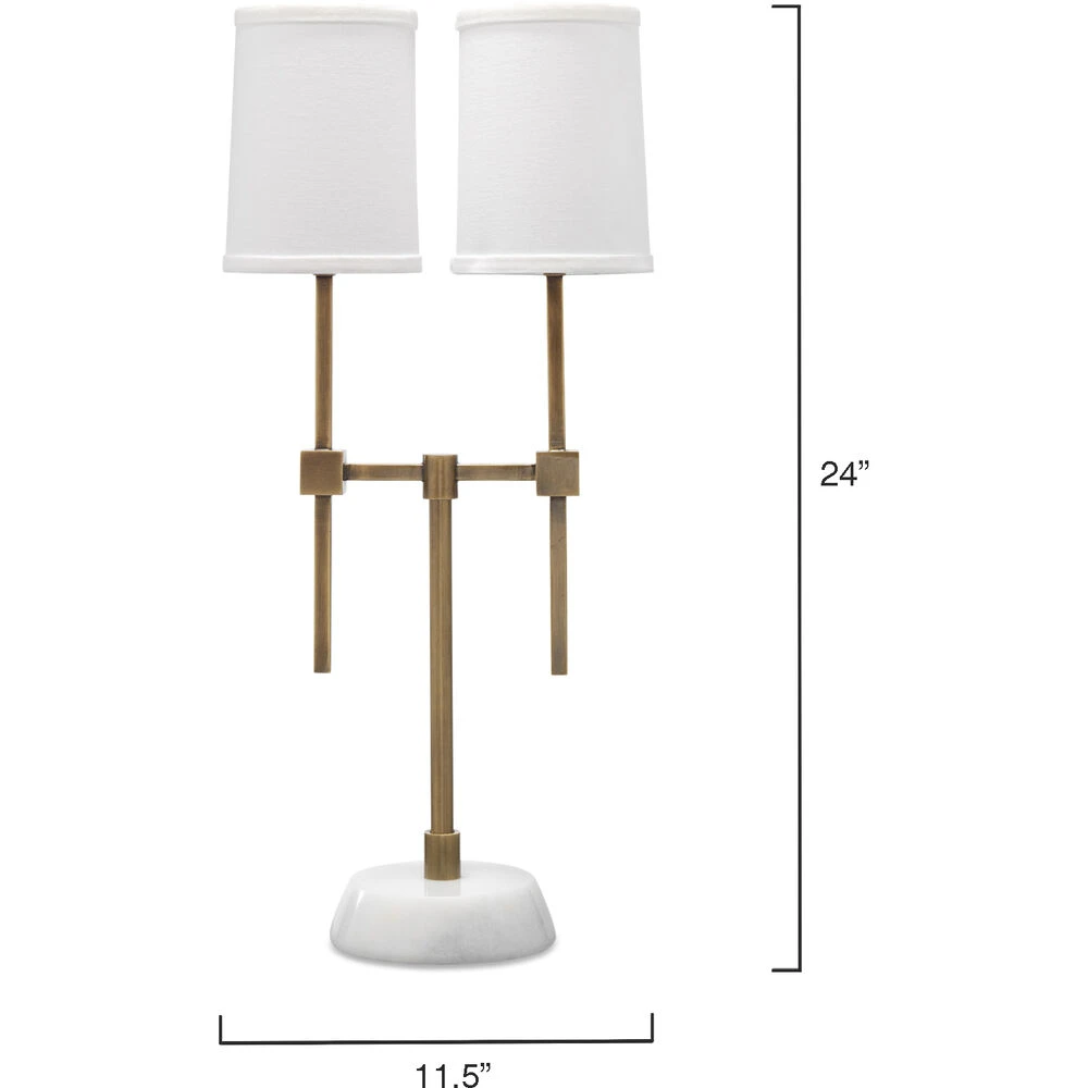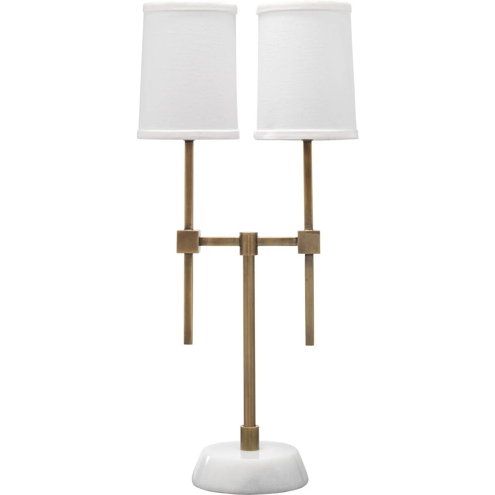 Industrial yet elegant, the dual shade design of the Minerva lamp provides a customizable and stylish lighting solution. Anchored by a solid marble base, the two arms are each handcrafted of steel and finished in antiqued brass. Two off-white linen drum shades provide a dash of softness.