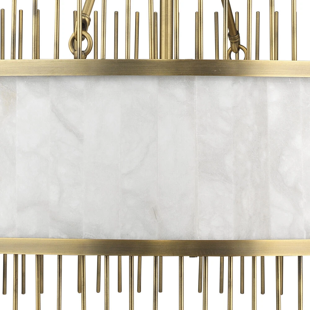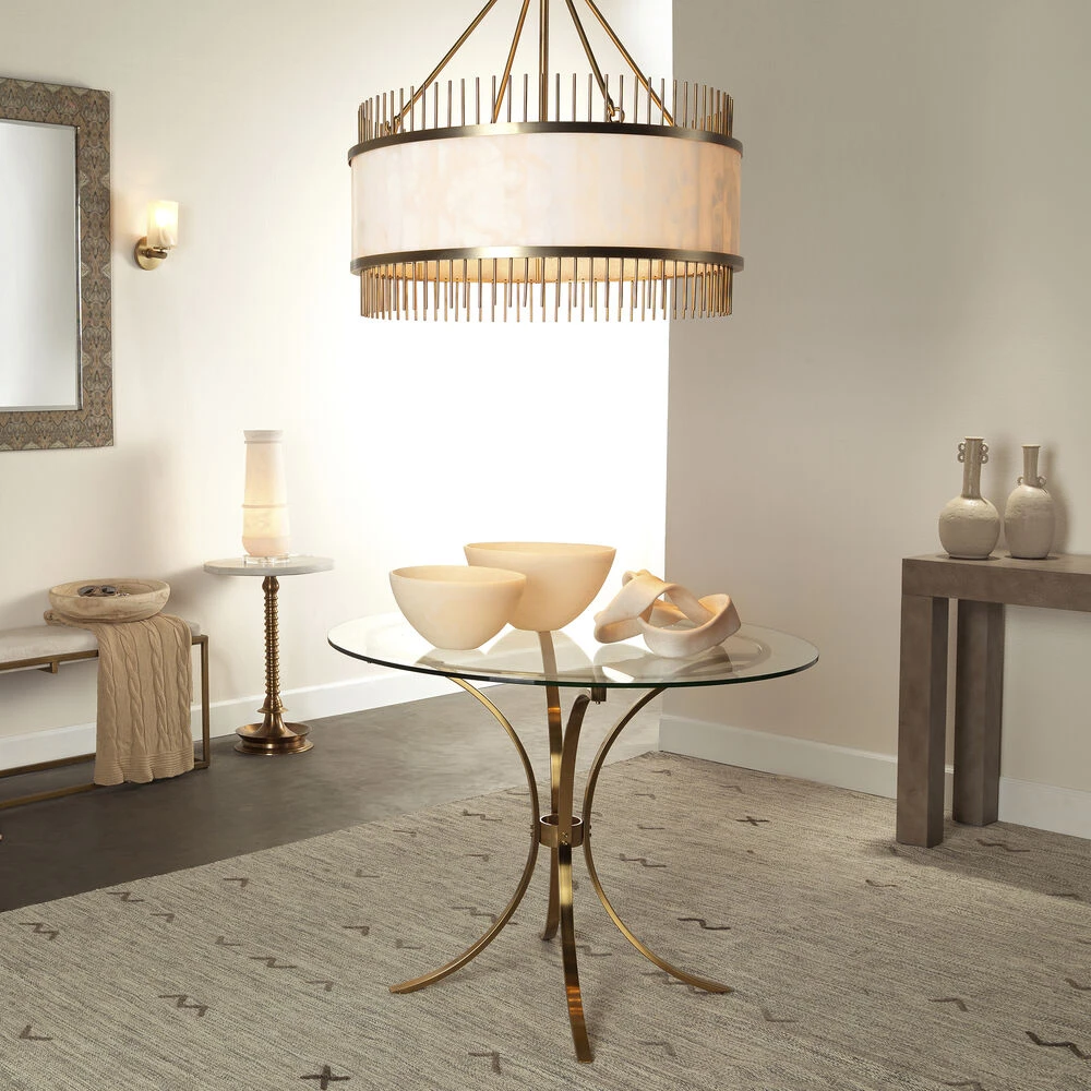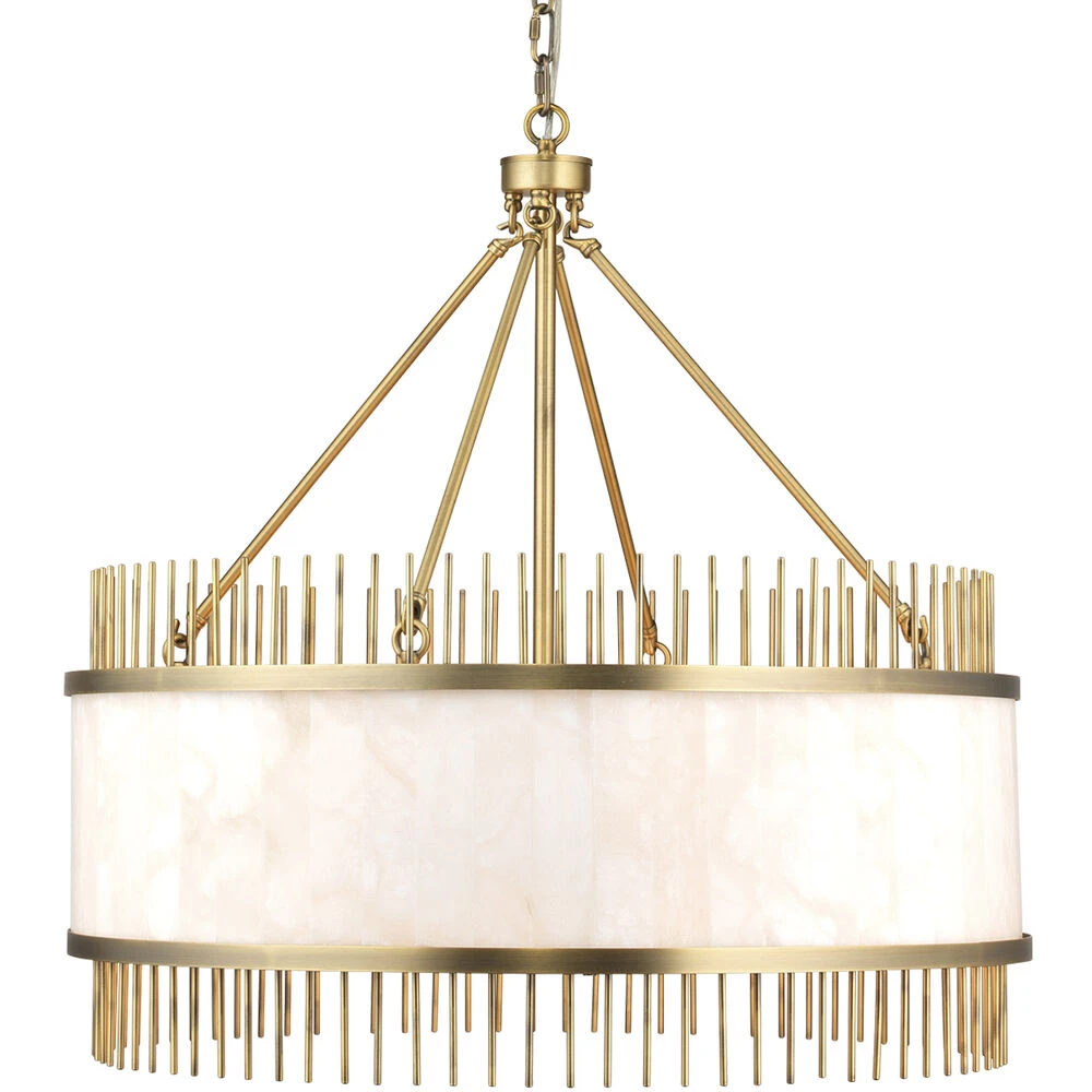 Our Upsala Chandelier is a statement worthy fixture in crisp white alabaster trimmed in warm antique brass. The jaw-draping circumference is accented with brass posts to extend the design in an architectural, airy way. This piece truly exhibits all around glamour!